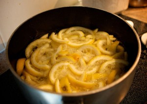 – Cáscaras confitadas: cortá en tiras las cáscaras de 10 limones y ponelas a hervir en una olla con agua durante dos minutos. Enfriá, colá el agua, y repetí el mismo procedimiento dos veces más. En otra olla, prepará un almibar usando 100 gr de azúcar y agua. Una vez listo, añadí las cáscaras al almibar y cociná a fuego lento hasta que se seque. Cuando esto suceda, retiralas del fuego y dejalas secar sobre un papel de cocina.
