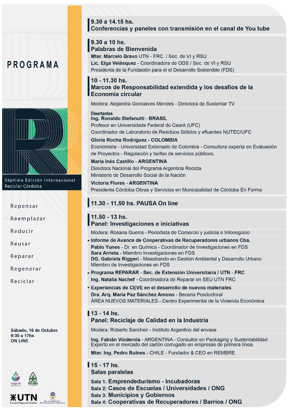 Disertarán: el Ing. Ronaldo Stefanutti – BRASIL – Profesor en Universidade Federal do Ceará (UFC). Coordinador de Laboratorio de Residuos Sólidos y efluentes NUTEC/UFC; Gloria Rocha Rodriguez – COLOMBIA – Economista – Universidad Externado de Colombia – Consultora experta en Evaluación de Proyectos- Regulación y tarifas de servicios públicos; María Inés Castillo – ARGENTINA – Directora Nacional del Programa Argentina Recicla- Ministerio de Desarrollo Social de la Nación; Victoria Flores – ARGENTINA – Presidenta Córdoba Obras y Servicios en Municipalidad de Córdoba.