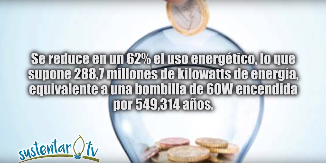 – Se reduce en un 62% el uso energético, lo que supone 288,7 millones de kilowatts de energía, equivalente a una bombilla de 60W encendida por 549,314 años.