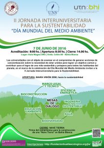7 de Junio de 2016: II JORNADA “Día Mundial del Medio Ambiente” Las universidades con el objetivo de avanzar en el compromiso de generar acciones de concientización sobre la necesidad de estar unidos para lograr un objetivo en común y contribuir para el logro de una vida sostenible y próspera para todos los habitantes del planeta, en el marco de la celebración del Día Mundial del Medio Ambiente invitan a la II Jornada Interuniversitaria para la Sustentabilidad.
