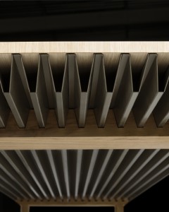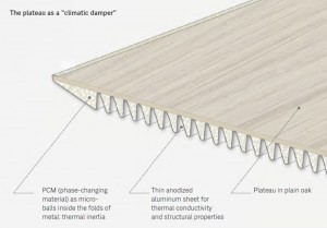 Esta tabla: tiene una alta inercia térmica. El secreto está en el uso innovador de materiales de cambio de fase (PCM), área integrada de entre les madera lisa y la hoja plegada de aluminio anodizado.