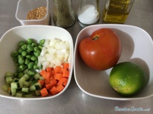 - Cocinar los guisantes en agua hirviendo con sal durante 5 minutos colar y reservar, aparte cortar la cebolla, el pepino con cascara y la zanahoria en cubos pequeños.