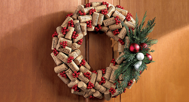 Las coronas navideñas con corchos son los adornos más populares, para realizarlos solo se debe recortar una base de cartón y pegar sobre ella decenas de corchos. Si no se tiene tanta cantidad de corchos, se pueden cortar a lo largo e ir pegando las mitades. Para mantener la forma de corona es recomendable guiarse con un plato o bandeja redondeada.