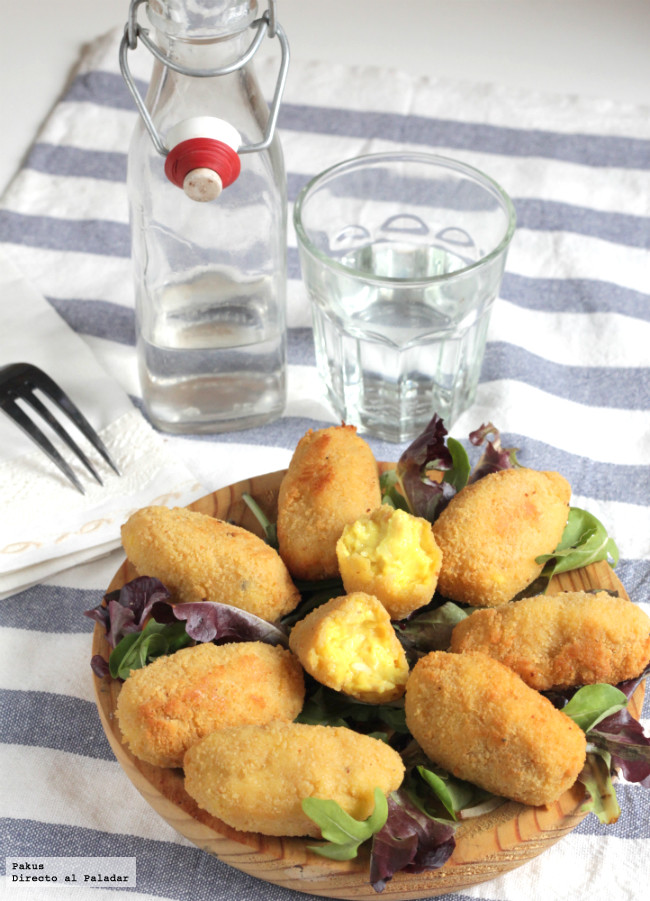 Después, como en todas las recetas de croquetas, dejamos enfriar la masa en la nevera durante 8 horas, formamos las croquetas y las pasamos por harina, huevo y pan rallado antes de freírlas en aceite muy caliente. Una vez fritas, conviene comerlas inmediatamente para que estén bien crujientes.