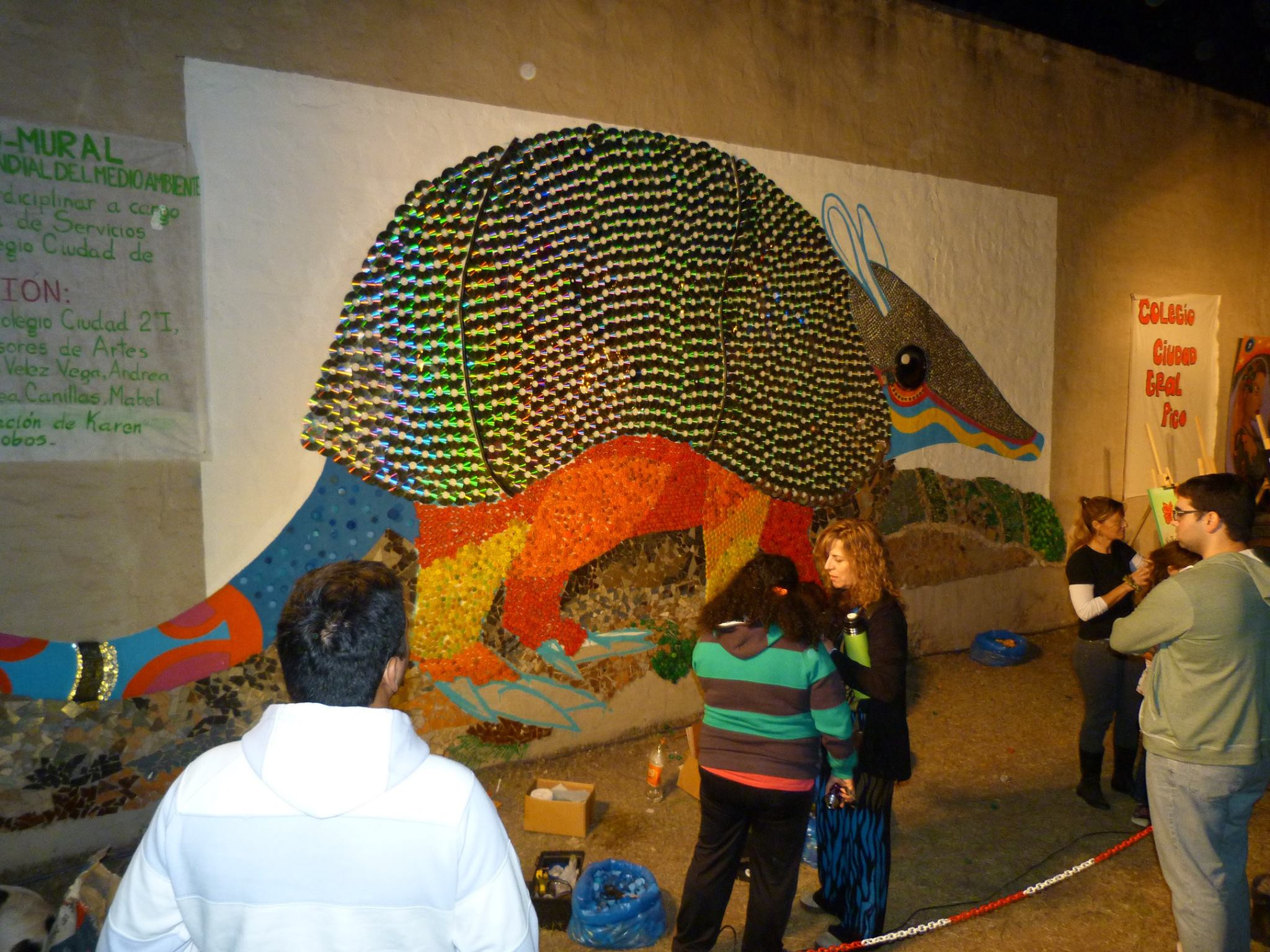 Pero para poder hacer realidad este proyecto se necesitó de la colaboración de todos los vecinos, para el acopio de más de 1000 CDs . Se inauguró el Eco-Mural con la participación de artesanos, estudiantes, músicos, artistas plásticos y gente que se sumó a la movida en el marco de la Semana del Medio Ambiente. Desde las 15 horas y hasta ya entrada la noche se fueron rotando músicos y bailarines sobre el escenario, mostrando lo que saben hacer o simplemente divirtiéndose.
