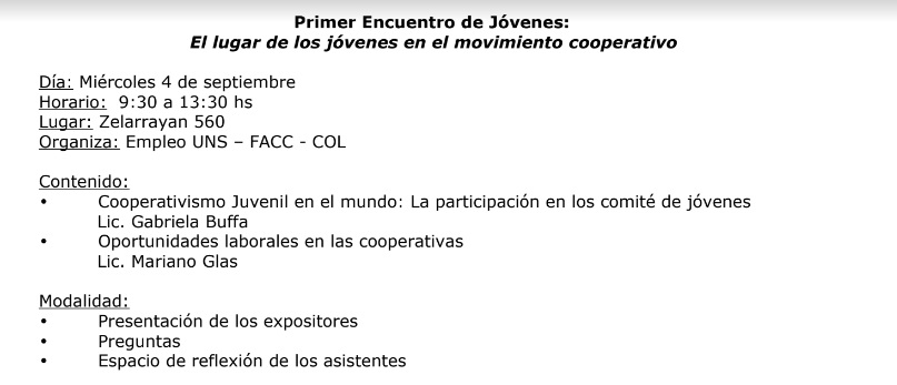 El miércoles 4 de septiembre entre las 9:30 a 13:30 se llevará a cabo Zelarrayan 560, el Primer Encuentro de Jóvenes convocado por la Federación Argentina de Cooperativas de Consumo y el área de Empleo de la Universidad Nacional del Sur. Esta actividad lleva por título “El lugar de los jóvenes en el movimiento cooperativo”.