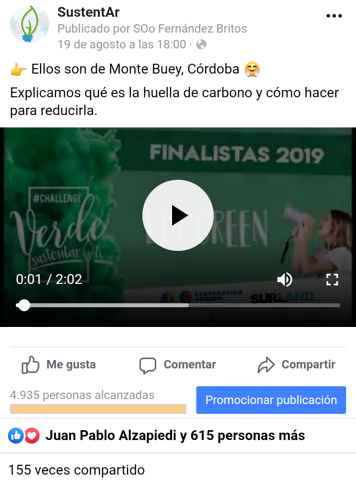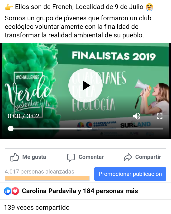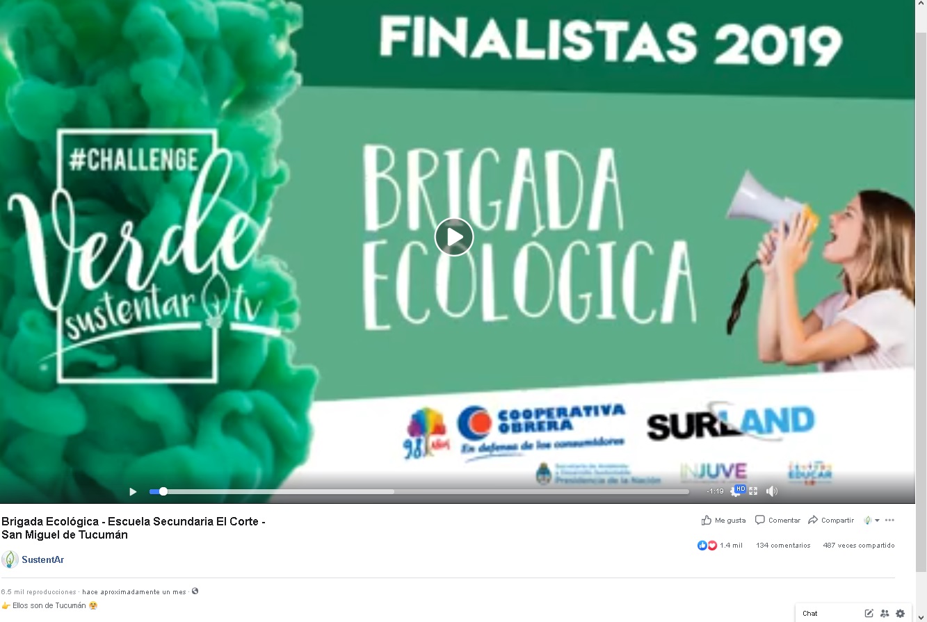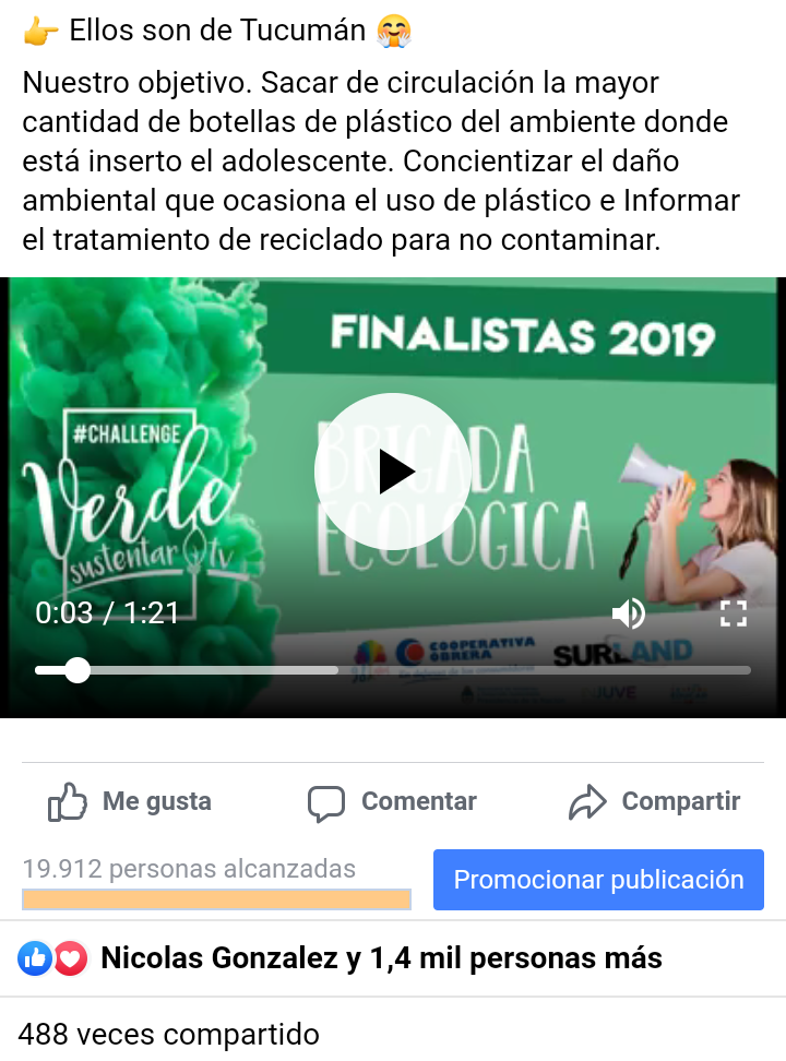 Brigada ecológica de Tucumán, con una amplia ventaja sobre los demás equipos, un alcance de más de 19 mil personas un total de 6.5 mil reproducciones, 1400 me gusta y 134 comentarios.
