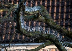 Los clavos son habituales en los centros comerciales de la ciudad, para evitar que los pájaros defequen sobre los visitantes. Pero es la primera vez que se colocan sobre ramas de los árboles, que son su lugar de descanso habitual.