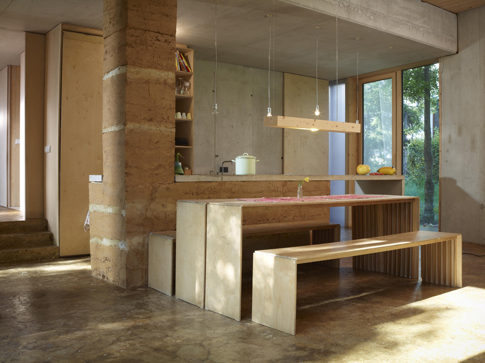 Para salvar los árboles, el compuesto de madera-cemento se trabajo desde paredes que se derrumbaron, y se reutilizaron en la placa base y secuencialmente plegados como un Falthaus. Materialización, es de una simbiosis de materiales locales, objetos encontrados en la región,la arcilla para los cimientos, la madera de los bosques de Viena para la calefacción por suelo radiante o el cáñamo de la República Checa, para lograr aislamiento.