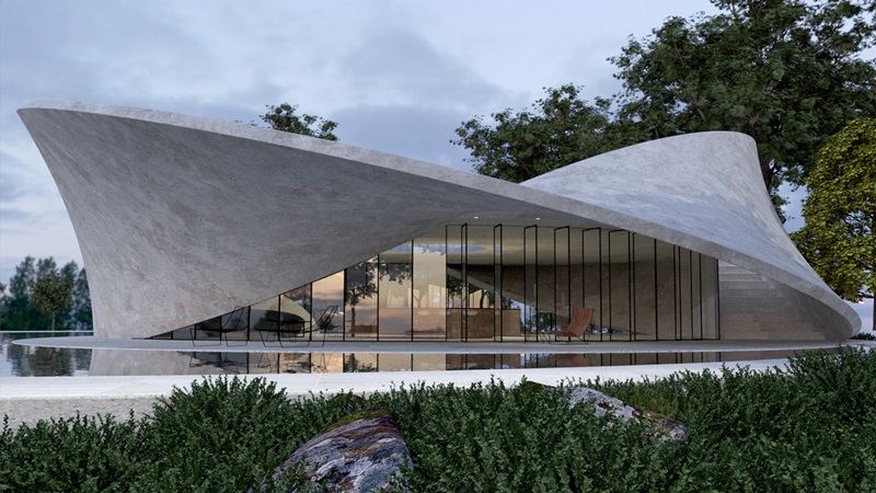 Casa Mobius de Antony Gibbons Design: Esta casa, inspirada en la tira de Möbius, está completamente hecha de bloques de cáñamo reforzado con hormigón. El diseño estructural y la elección de materiales son una respuesta innovadora a los desafíos impuestos tanto por las matemáticas como por la arquitectura. Toda la casa contacta con el piso solo a través de unos pocos metros, mientras que el techo rigidiza todo el marco del edificio. El interior tiene luz natural a través de las ventanas de piso a techo.