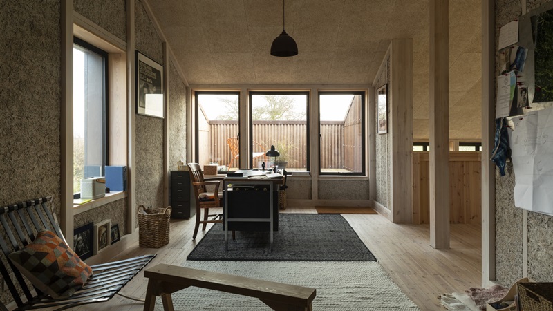Casa plana de Material Cultures: Esta casa de Cambridge, Inglaterra, fue diseñada con el objetivo de crear un prototipo de construcción prefabricada a base de cáñamo para un uso mayor y más amplio del hempcrete. Los arquitectos, ingenieros y especialistas en materiales colaboraron para desarrollar un panel prefabricado relleno con cáñamo que se cosechó en una finca de 20 acres. Esta colaboración condujo a la creación de un nuevo producto de revestimiento de fibra de cáñamo y al establecimiento de Material Cultures, organización de investigación cuyo objetivo es explorar biomateriales en el contexto de la construcción fuera del sitio.