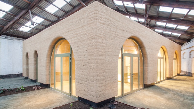 Casa Regional de BC Architects: Este centro comunitario en Edeghem, Bélgica, ubicado dentro de un parque público fue construido para fortalecer la función actual del parque. El desarrollo creó una experiencia educativa y participativa que explora un enfoque ecológico y sostenible de la construcción, lo que sirvió a su comunidad incluso durante la fase de construcción. Los materiales incorporados al centro comunitario incluyen bloques de tierra comprimida y cáñamo, que se utilizó para aislar las fachadas y el techo. Se produjeron 19.000 bloques de tierra comprimida en un taller de 3 semanas, y más de 150 voluntarios instalaron 213 metros cuadrados de hempcrete en un taller de 2 semanas.