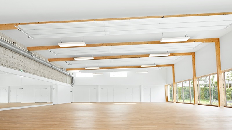 Centro deportivo Pierre Chevet de Lemoal Lemoal: Se trata del primer edificio público de hempcrete de Francia, sostenido por un marco de media bóveda de madera que se une a las paredes de cáñamo para soporte. Este sistema aprovecha al máximo el interior sin columnas, que es una demanda de un polideportivo. Otra demanda de un edificio de este tipo es el aislamiento acústico, algo para lo que, como se mencionó anteriormente, las paredes de hempcrete funcionan muy bien. Los bloques de hempcrete se ensamblaron en seco y se conectaron a través de un sistema de enclavamiento que no requiere adhesivos ni mortero. Además, los paneles de cáñamo se cosecharon y fabricaron a menos de 500 kilómetros del sitio del centro deportivo, lo que minimizó las emisiones de transporte.