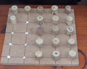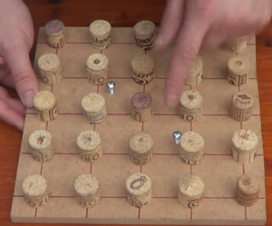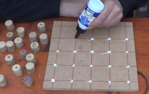 6) Lo más centrado posible pondremos los corchos en el medio de las intersecciones. La cola nos ayudará a reforzar esta unión entre el tablero y los corchos.