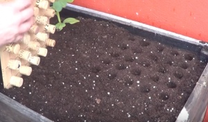 Agarramos nuestra herramienta de cultivo, y la apretamos bien sobre nuestra mesa de cultivo. Luego levantamos de la manija, y ahi nos quedan los pocillos para las semillas, dependiendo de que sembremos usamos todos o saltamos de dos en dos, por ejemplo, si colocamos rabanitos, podríamos usar todos los pocillos. Si fuese espinaca, saltemos uno.