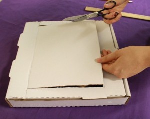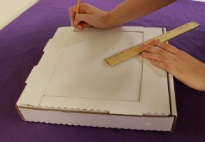 - Toma la caja cerrada de pizza y dibuja un cuadrado con un lápiz, dejando alrededor de una pulgada de distancia del borde.