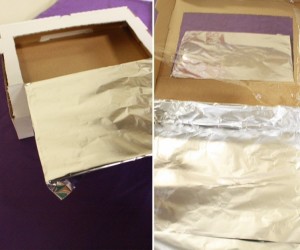 - Cubre el fondo y los lados de la caja también con papel aluminio. Luego, corta un trozo de papel negro y pégalo en la base.