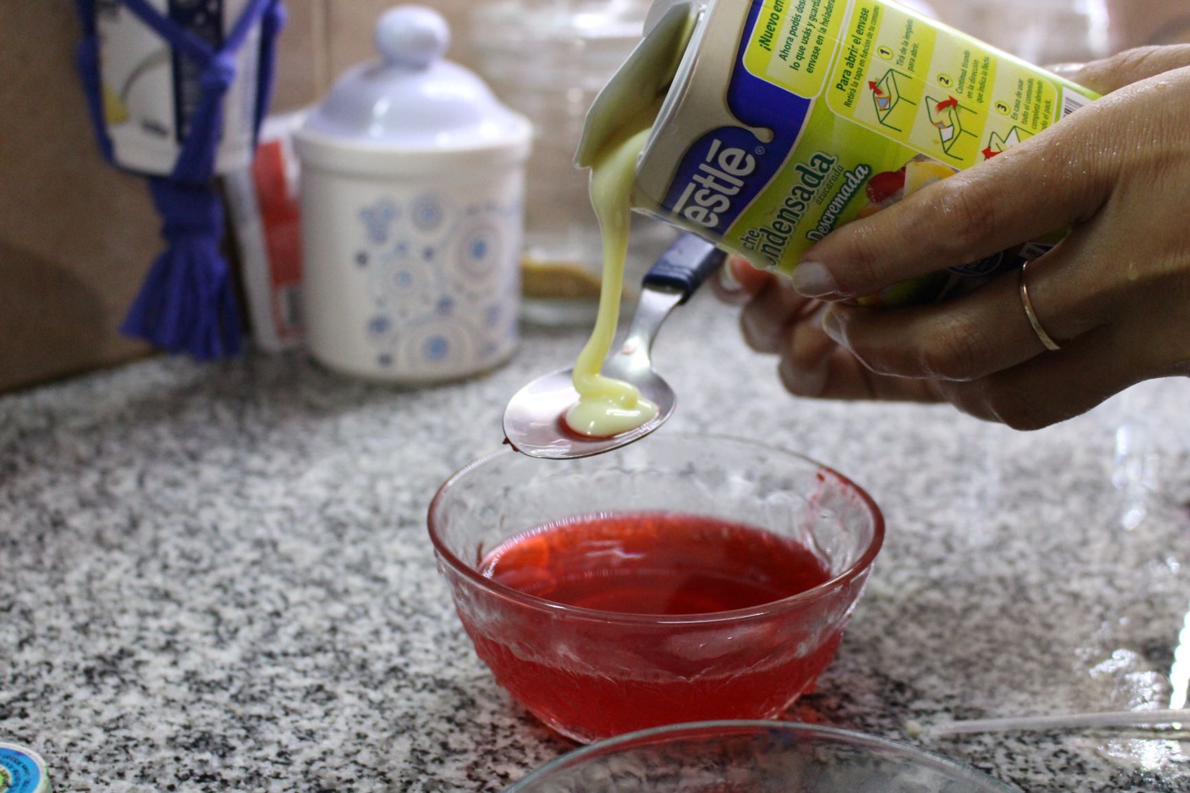 Con una jeringa ir vertiendo el primer color, enfriar en la heladera, muchas recetas dicen 15 min, a mi no me funciono, la tuve que dejar bastante más, al segundo color le mezclaz la leche condensada y cuando cuaja el primer color que pusiste en la heladera le viertes el segundo y asi sucesivamente hasta rellenar, luego romper la cascara y presentar en una fuente… Y listo originales huevos de pascua …