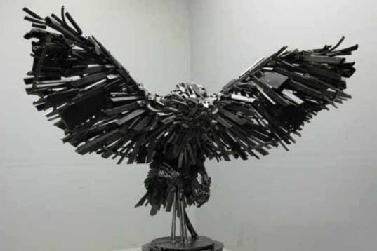 El experto artista Travis Pond de Steel Pond creó algunas esculturas de animales bestiales reciclando motocicletas deconstruidas. Al soldar todo tipo de elementos como tuercas, pernos y piezas de metal aleatorias de Honda y Yamha, crea búhos, grúas y dragones increíblemente expresivos que son hermosos y ligeramente ominosos.