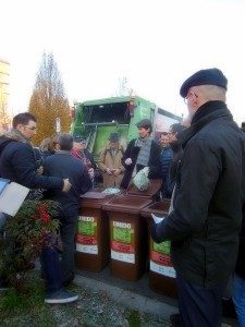 La recogida de la materia orgánica (y del resto de residuos) se realiza en contenedores de 120 litros que se reparten a las comunidades o en cubos unifamiliares. Las bolsas donde se depositan deben ser biodegradables, pero en Italia son las que se ofrecen de forma habitual en los comercios, ya que está prohibido otro tipo de bolsas. En los pisos en altura es necesaria la existencia de un responsable de la sacada de los cubos (con los materiales adecuados). Sería similar al trabajo realizado en los barrios de Madrid, donde es necesario que una persona contratada saque los cubos a la calle, pero con mayor especialización, ya que también se encarga de que la separación sea correcta.