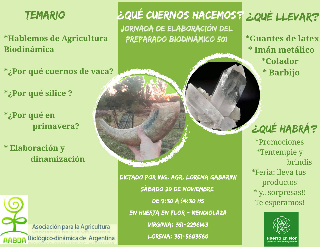 El próximo sábado 20 de noviembre de 9.30 a 14.30, en El Biotiquín, espacio de Huerta en Flor, Mendiolaza, Córdoba, se va a estar desarrollando un encuentro único en el cual, Lorena Gabarini, Ingeniera Agrónoma, docente de AABDA (Asociación Agricultura Bio Dinámica Argentina), nos va a enseñar a elaborar el preparado 501 (sílice molido en cuerno).