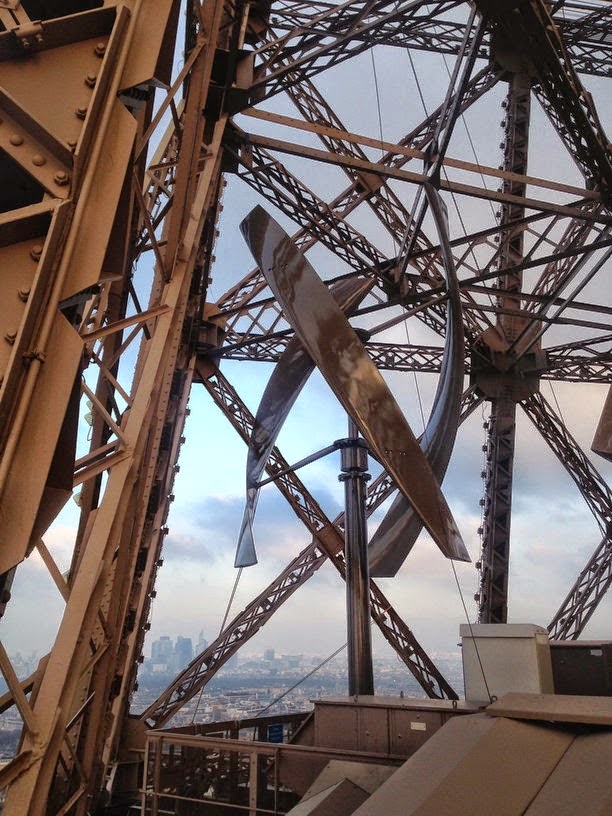 Durante estos últimos meses incorporaron dos turbinas eólicas de eje vertical de unos 7 metros de longitud a unos 122 metros sobre el nivel del suelo para aprovechar el viento que hay en la ciudad de París. Su función será producir unos 10.000 kWh de electricidad al año y ayudará a compensar el consumo que tiene toda la actividad comercial de la Torre. Los aerogeneradores eólicos fueron instalados por la compañía estadounidense Urban Green Energy y las dejó de tal manera que pasan desapercibidas.
