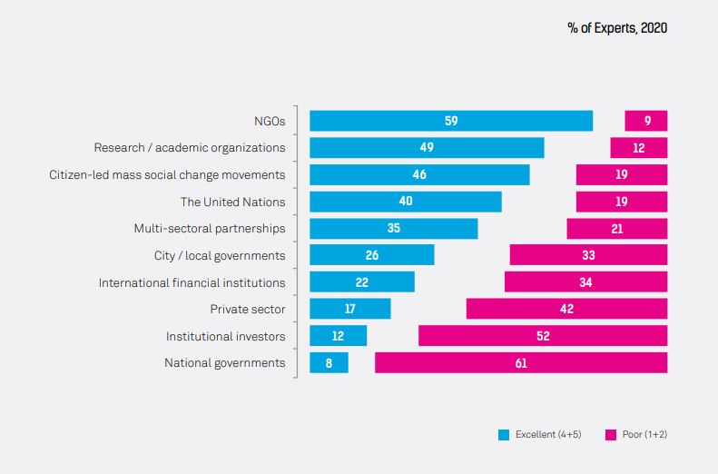 Respecto al sector privado, “la reputación general sigue siendo sombría”, ya que “solo el 17 % de los encuestados cree que las empresas están haciendo su parte para avanzar en la agenda de desarrollo sostenible, con la reputación en declive constante después de alcanzar su punto máximo en 2018. El reconocimiento de los esfuerzos de las Naciones Unidas (40 %) también ha disminuido ligeramente desde el año pasado”.