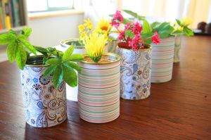 Una de las ideas, quizás más simples de hacer, pero no por eso poco bonitas, es la de reutilizar las latas para crear floreros con los que decorar la mesa de luz o la sala de estar.