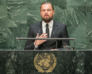 DiCaprio se dirigió a los líderes mundiales reunidos en la ultima Cumbre del Clima de las Naciones Unidas, instándoles a que adopten medidas para combatir “el mayor desafío de nuestra existencia en este planeta.” Durante el discurso dijo: “Como actor, finjo para ganarme la vida. Represento a personajes ficticios a menudo resolviendo problemas ficticios. Creo que la humanidad ha mirado el cambio climático de la misma manera, como si fuera ficción”