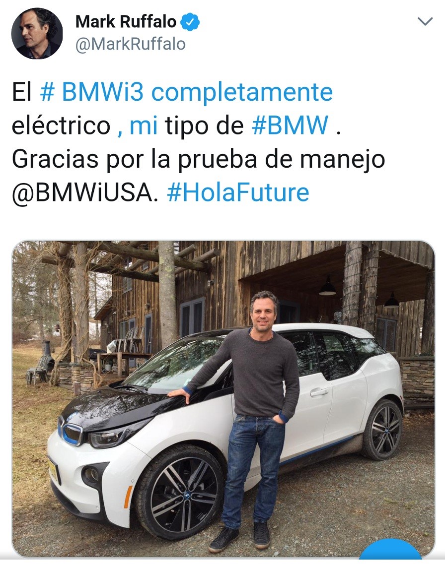 El actor que interpreta a Bruce Banner, Hulk, en la saga de Avengers, maneja un BMWi3, uno de los pocos autos eléctricos vendidos por esa compañía. Muchos, en tono de broma han dicho que llama la atención que Hulk tenga este lado amigable con el planeta y haya elegido este coche de dimensiones pequeñas…Mide 4 m de largo y apenas 1,58 m de alto. Pero lo cierto es su habitáculo es espacioso, y tiene una autonomía de 300km. Así lo mostraba en Twitter…