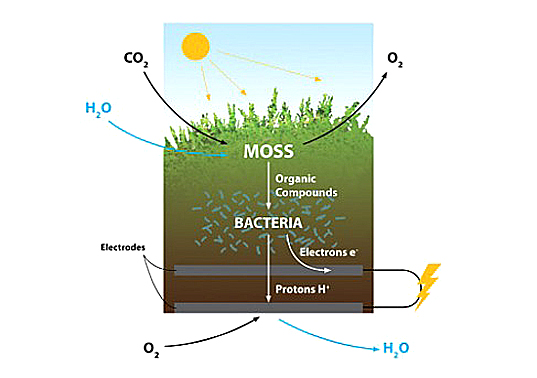 Biophotovoltaics es una empresa que cree que no sólo es posible, sino que hasta es una buena idea; por ende, creó esta mesa que en inglés se llama The Moss Table (mesa de musgo). La energía eléctrica se crea por el proceso de fotosíntesis, donde los electrones se capturan con fibras conductoras y la energía química se transforma en energía eléctrica.