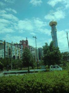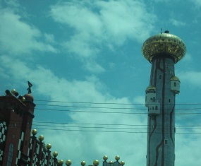 De la torre de escape de gases de 120 metros de altura, están saliendo casi nada de gases tóxicos como dioxinas, óxidos de nitrógeno, dióxidos de azufre. El aire con las substancias malolientes se elimina en el horno.s onduladas una torre con una cúpula de oro, pero es realmente un gran incinerador de desechos.