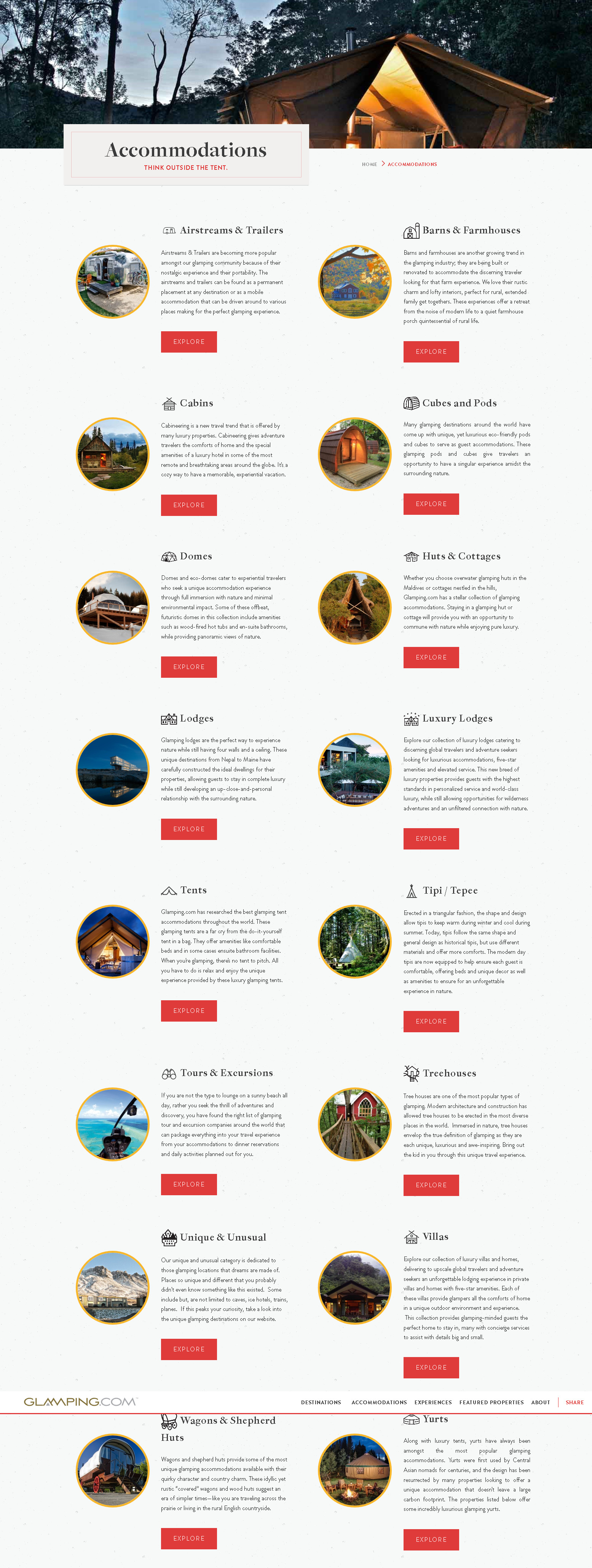 Así que hoy en día podemos encontrar campamentos más o menos lujosos en los cinco continentes. Tomando su inspiración en muy variados tipos de construcciones (tipis amerindios, tiendas de safari, yurtas del Asia Central, cabañas en los árboles, caravanas y roulottes….) tratan de ofrecer al huésped un contacto estrecho con la naturaleza, intimidad y aislamiento, sin que éste deba renunciar al confort ni, en algunos casos, al lujo y a la buena gastronomía.