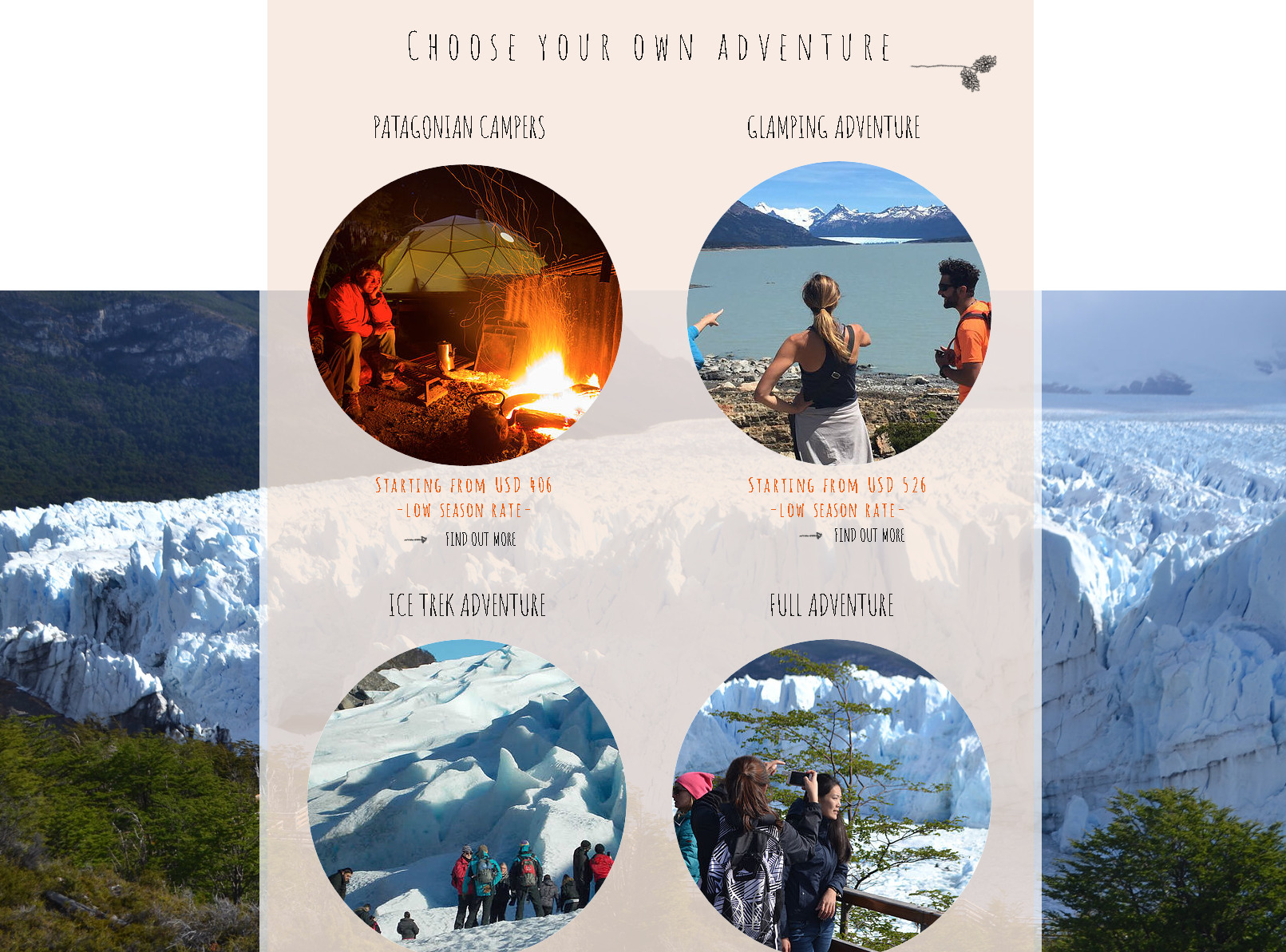 Ubicado en la en la Península Las Colonias, entre los Lagos Roca y Rico, se encuentra rodeado por el Parque Nacional Los Glaciares y frente al glaciar Perito Moreno, que se eleva majestuoso a sólo 12 kms del campamento.