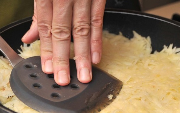 Luego rociar el recipiente con aceite vegetal y colocar la papa rayada (colar antes para que no les quede líquido). Extender y presionar con tenedor para que quede finita.
