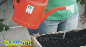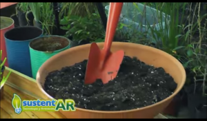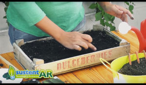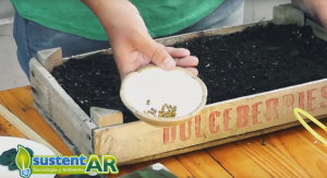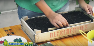 – Recipiente. En este caso utilizamos un cajón reciclado, que como vimos en los micros anteriores lo forramos con un nylon negro y lo completamos con tierra, sustrato que es para realizar los almácigos.