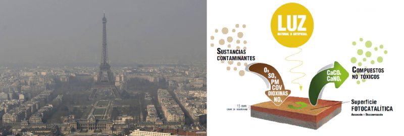 Pintura que pueden eliminar la contaminación del aire es posible mediante un proceso llamado fotocatálisis. Este tipo de pintura absorbe otros contaminantes atmosféricos mediante un proceso químico activado por la energía solar. Teniendo la la propiedad de purificar de malos olores a los ambientes, y de eliminar sustancias nocivas para la salud.