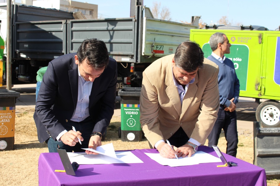 En el día de hoy el Municipio de Godoy Cruz junto al Municipio de Junín en Provincia de Mendoza,en el predio Menotti Pescarmona firmaron un convenio en donde Godoy Cruz le entrega a Junin, PET molido en la planta reciclaje, #JunínPuntoLimpio se llama el programa . Y, con este material, el municipio hará más productos reciclados, como ladrillos y tejas PET.Los firmates intendente Tadeo García Zalazar y Intendente Mario Abed, Junin.