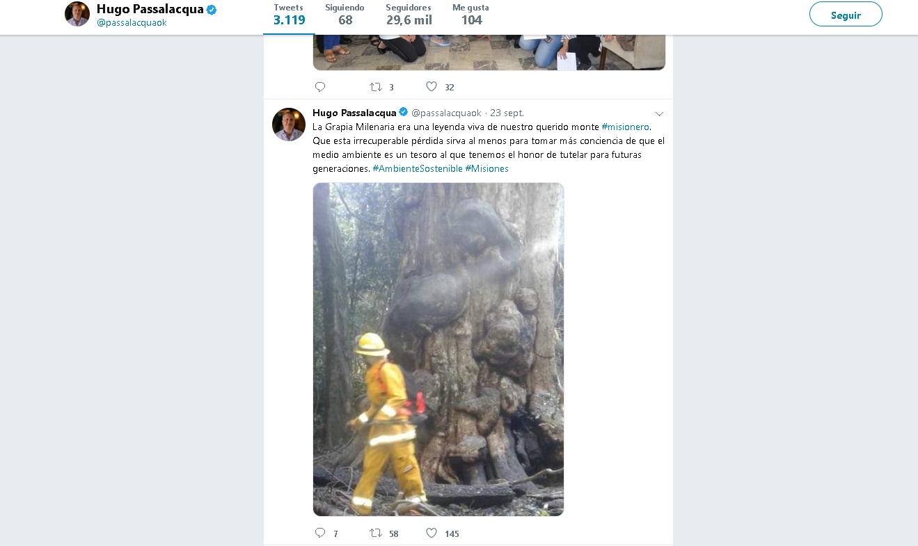 El gobernador de Misiones, Hugo Passalacqua, también expresó su indignación por el incendio de la Grapia. “La Grapia Milenaria era una leyenda viva de nuestro querido monte #misionero. Que esta irrecuperable pérdida sirva al menos para tomar más conciencia de que el medio ambiente es un tesoro al que tenemos el honor de tutelar para futuras generaciones. #AmbienteSostenible #Misiones”, escribió en su Twitter.