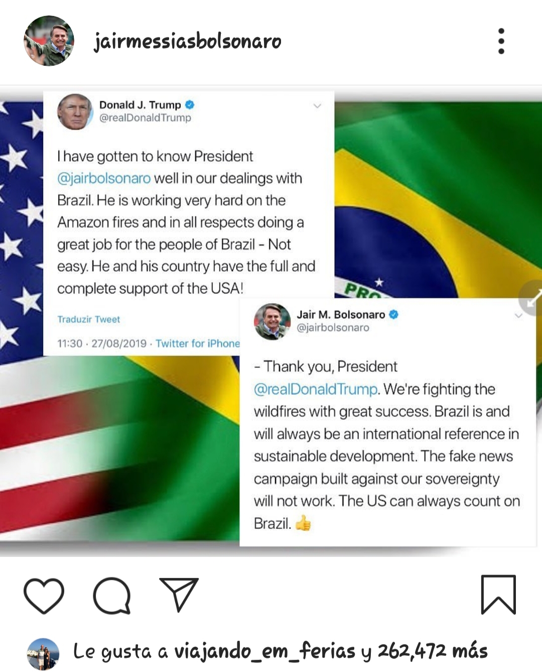 «Conocí al Presidente Bolsonaro bien en nuestras relaciones con Brasil. Él está trabajando duro en los incendios con la Amazonia y, en todos los aspectos, haciendo un gran trabajo para el pueblo de Brasil – no es fácil Él y su país tienen el apoyo total y completo de los Estados Unidospresidente Bolsonaro» fue el tweet de Trump el 27 de agosto de 2019.