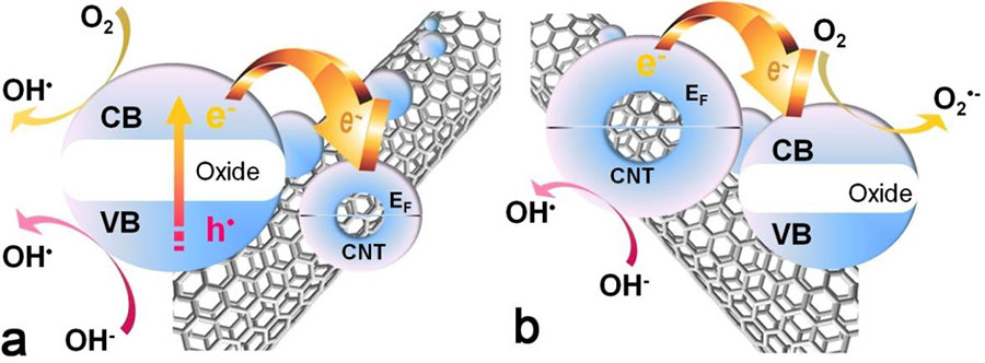 Durante la reacción de disociación se extiende la vida útil de la carga mediante la separación de la parte negativa (el electrón se transfiere al nanocarbono) de la positiva (el hueco se queda en el inorgánico), evitando así su recombinación y permitiendo que completen la reacción fotocatalítica.