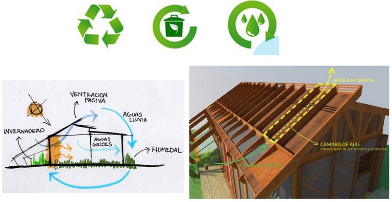La vivienda hace integracion de cuatro elementos: agua, aire, sol y tierra, de modo que puedan interactuar como en la naturaleza. El agua, elemento vital de los seres vivos, ingresa y se distribuye a través de un sistema que maximiza su uso eficiente, a través de aireadores y estrangulaciones en las válvulas de salida. Sigue su curso natural, tratándose por medio de un humedal artificial, quedando disponible para su reutilización y almacenamiento.
