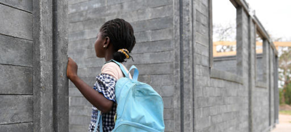 Una niña aprecia su nuevo salón de clase construido con ladrillos de plástico.UNICEF / Frank Dejongh