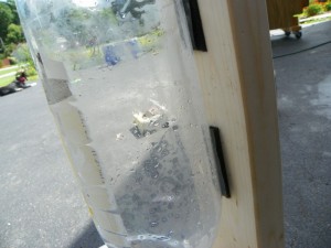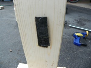 4) A continuación, adjunta una de las partes de la tira de velcro a lo largo de la longitud del listón de madera. La otra parte del velcro pégala a la botella.