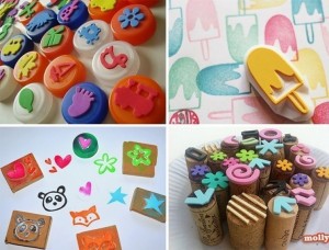 - Sellos caseros: Hacer sellos es muy divertido, porque sirven para decorar y hacer dibujos que quedan muy bonitos y coloridos, de una manera muy fácil. Podes cortar formas con goma eva y pegarla en tapas de gaseosa y voalá, sellos muy divertidos. Corchos tambien pueden usarse de manera creativa. O Papá calando la forma a la vieja usansa.