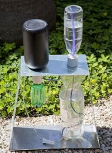 Una botella de material duro, de color negro, volcada sobre otra botella que contiene agua. Cuando el sol calienta el aire del interior de la botella oscura, este empuja el agua por el sistema y la expulsa finalmente por una pequeña manguera de goteo a los cultivos.