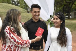 Liliana Di Franco, la subjefa de la segunda sección del distrito Sudoeste del Registro Civil, fue la encargada de oficiar el enlace civil. La funcionaria resaltó que el espacio donde se dio la ceremonia es “muy pintoresco, muy lindo realmente realzar la belleza de este jardín precioso y volver a verlo así”.