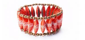 Pulsera reciclada: Si tienes habilidad con las manualidades, puedes conseguir hacer un brazalete como este que ves aquí y que está realizado con chapas de Coca-Cola que se han ido cerrando una a una.