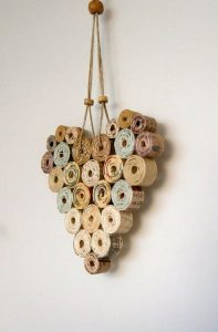 Muy romántico será decirle que se trata de los corchos de las botellas que han bebido juntos, como un símbolo renacido en sí mismo de vuestro amor. Puedes elegir las ramas y cortarlas en rodajas, rollitos de papel reciclado, botones, hecho reciclando una placa base, con tubos de papel higiénico, conchas de mar
