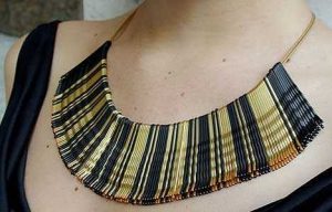 Pulsera reciclada: Si tienes habilidad con las manualidades, puedes conseguir hacer un brazalete como este que ves aquí y que está realizado con chapas de Coca-Cola que se han ido cerrando una a una.
